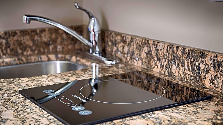 The quadruple room's kitchenette is available for cooking and storing food. The unit has 2 beds.